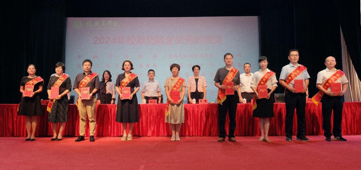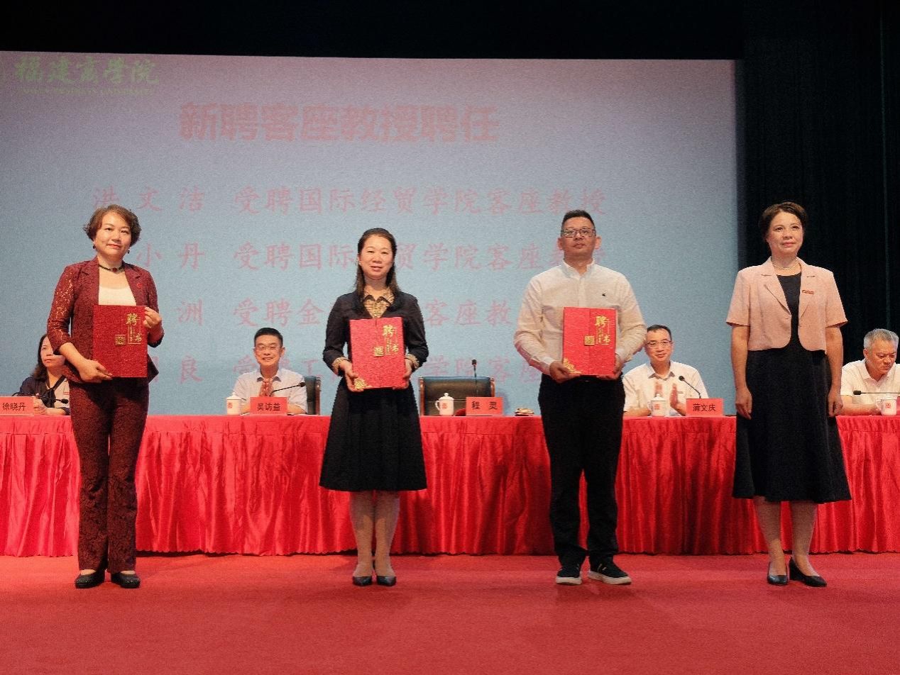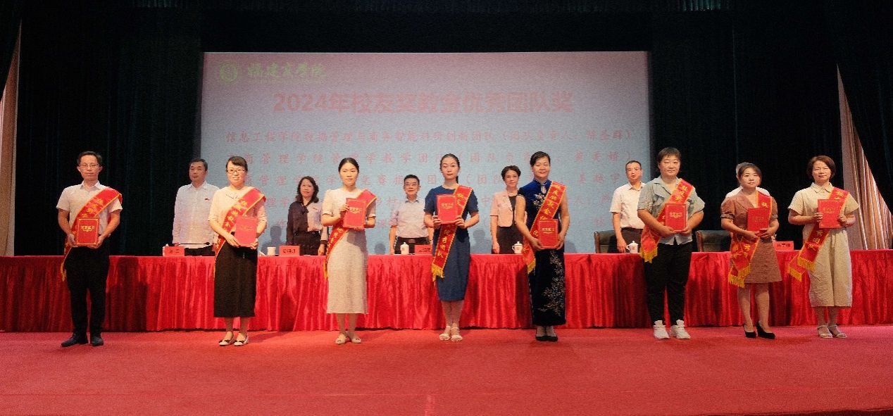 大会对获得2024年福建省第七届高校青年教师教学竞赛一等奖的工商管理学院教师陈颖、马克思主义学院教师陈翠,以及获得2024年度校友奖教金优秀教师奖、优秀团队奖、优秀青年教师奖的个人和团队进行了表彰奖励,并为新聘客座教授颁发聘书。