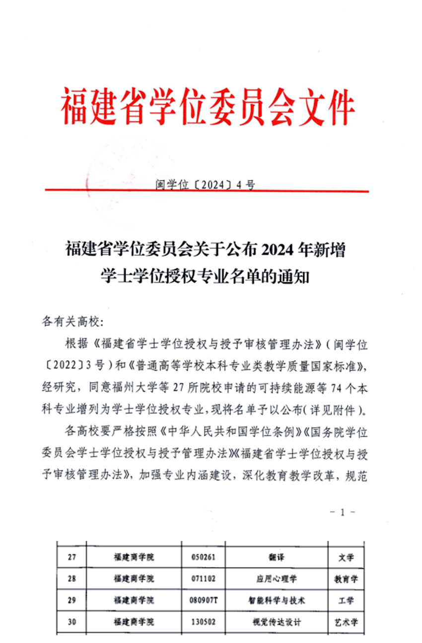 近日,福建省学位委员会下发了《福建省学位委员会关于公布2024年新增学士学位授权专业名单的通知》(闽学位〔2024〕4号)。金年会的翻译、应用心理学、智能科学与技术、视觉传达设计等4个本科专业顺利获批,增列为学士学位授权专业。