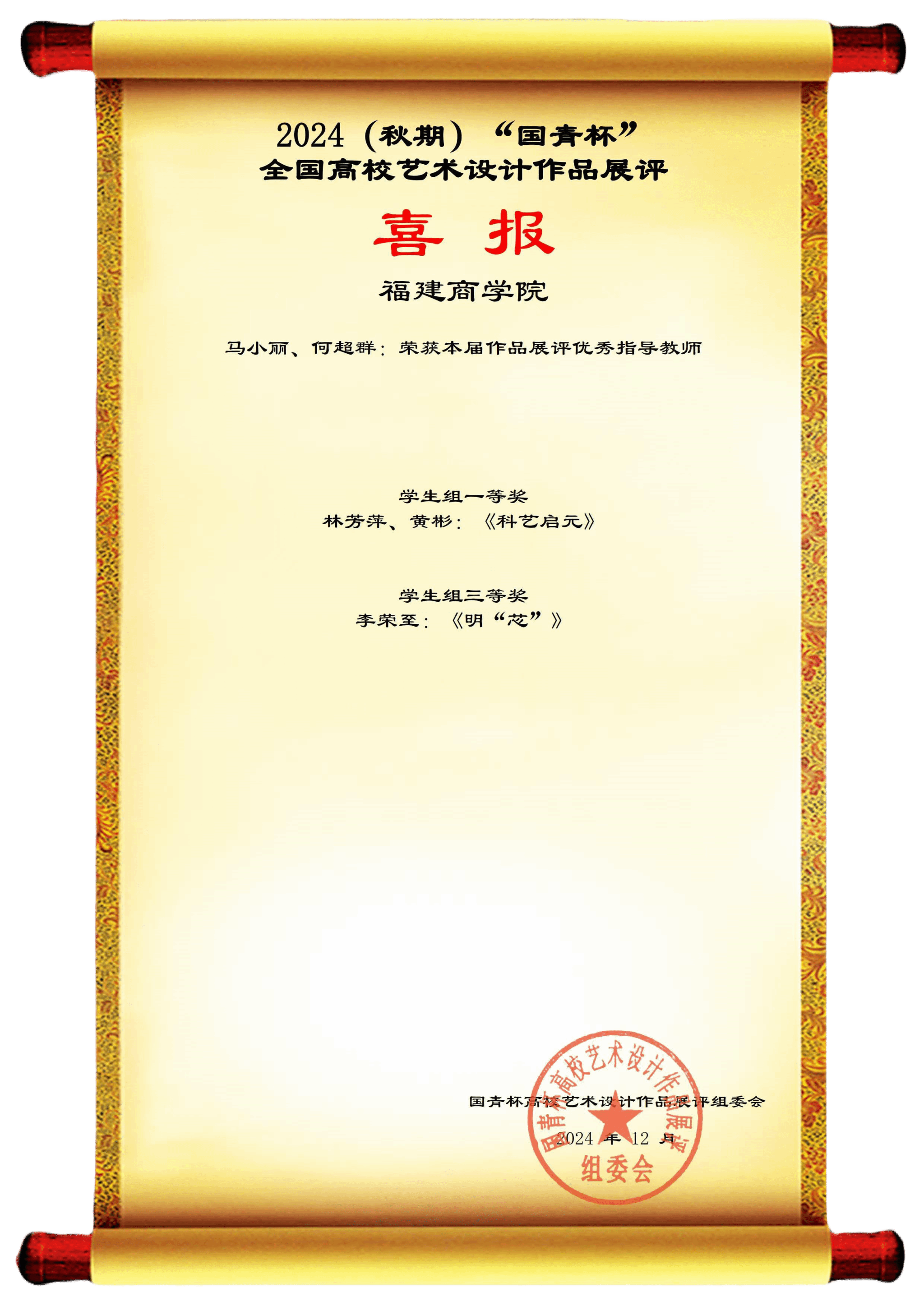 近日,由全国高校艺术设计作品大赛组委会主办的2024年“国青杯”全国高校艺术设计作品大赛圆满结束。金年会传媒与会展学院学生平面设计类作品在此次大赛中荣获一等奖1项、三等奖1项。马小丽、何超群两位老师荣获评本届作品展评优秀指导老师。具体获奖情况如下: