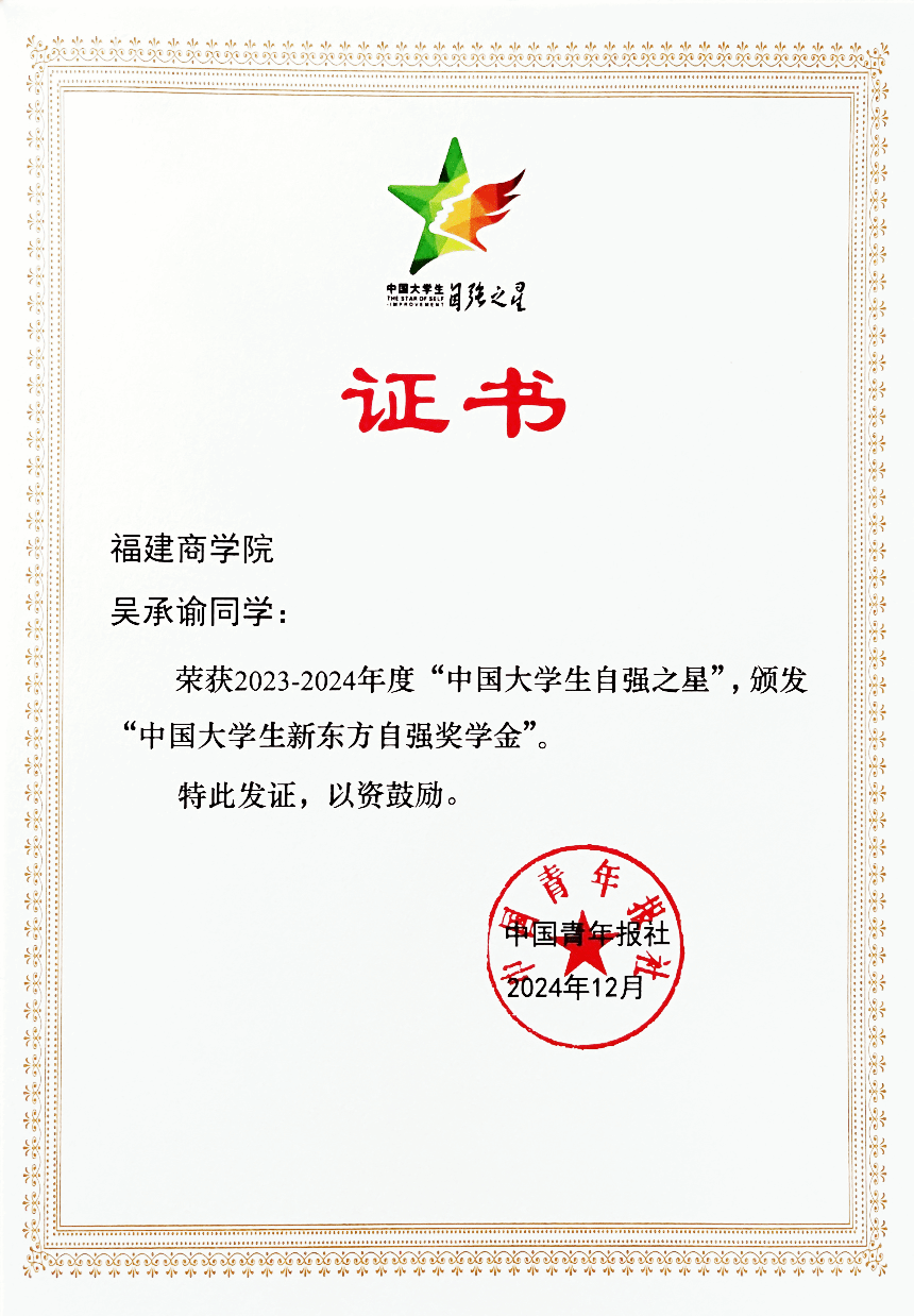 近日,由共青团中央、全国学联指导,中国青年报社、新东方教育科技集团、中国青年创业就业基金会联合开展的2023-2024年度“中国大学生自强之星”推报活动结果揭晓,金年会传媒与会展学院吴承谕同学荣获“中国大学生自强之星”称号。