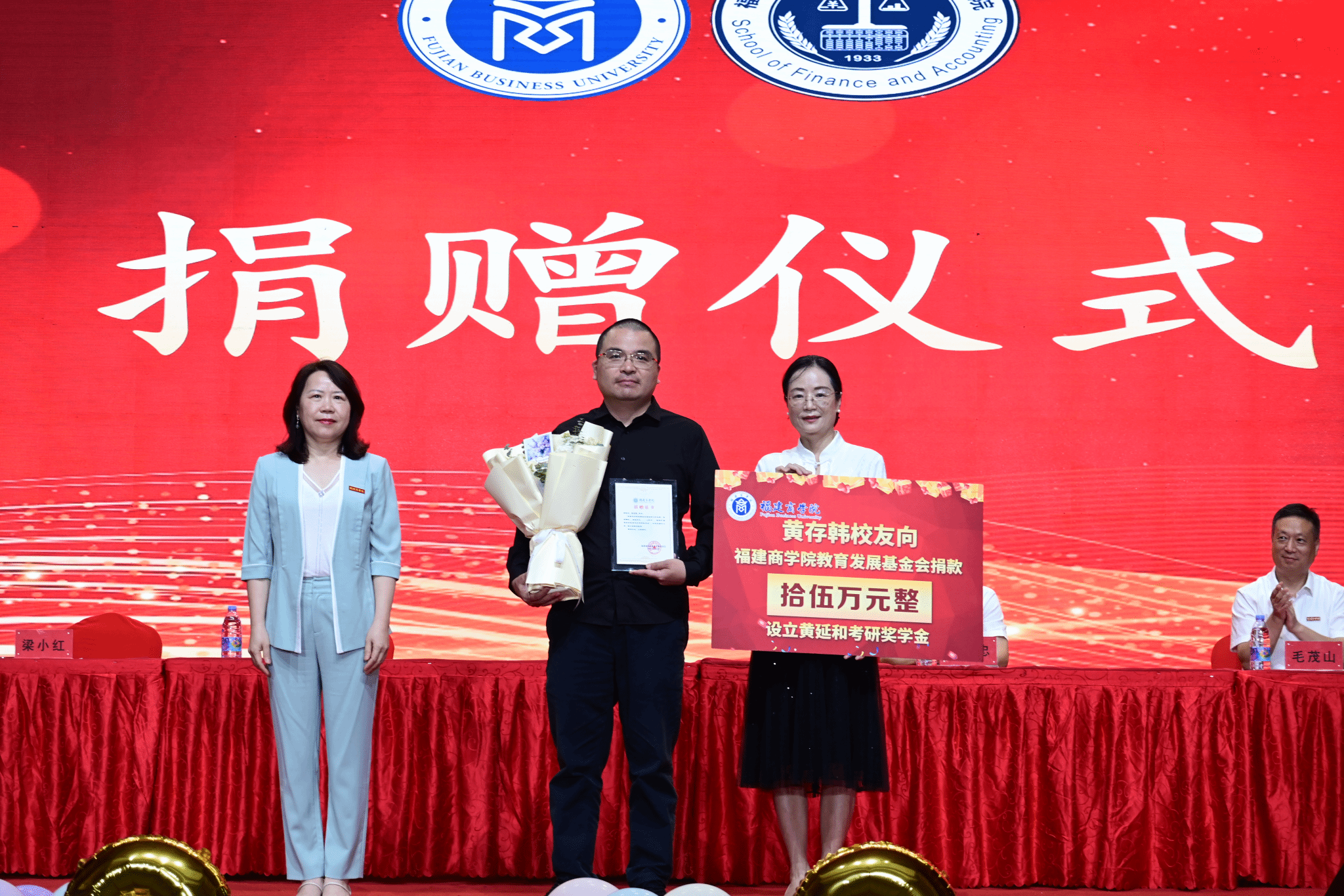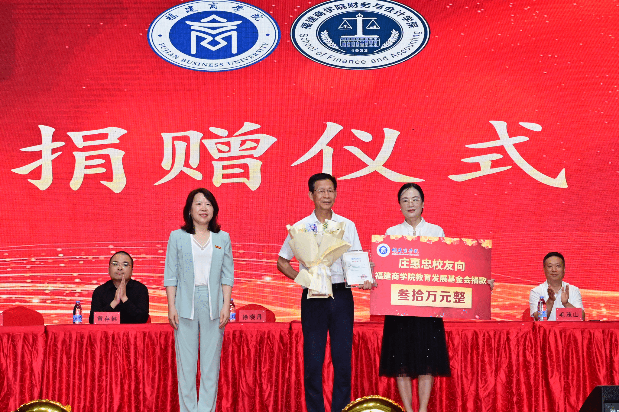 财务与会计学院主要负责同志代表学院郑重接受捐赠,徐晓丹向庄惠忠校友、黄存韩校友颁发捐赠证书。