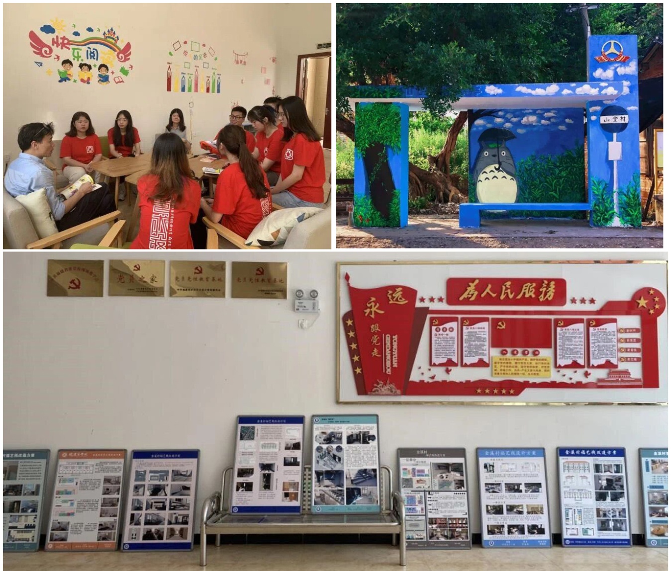 结对帮扶办实事。在活动中,实践团成员充分发挥青年党员、团员的先锋模范作用,努力解决群众“急难愁盼”之事,为基层留下一大批看得见、摸得着的成果。校团委乡村振兴实践团实地考察了东岱镇各个乡村的自然和人文风光,重点拍摄了特色产业、自然景观、人文景观等村容村貌,形成了《洪塘村的乡愁书记》《东岱街道美丽风光》等3个短视频,展现美丽乡村建设成果。团队还以卡通形象为元素,结合自然景观对山堂村公交车站进行墙面彩绘。在绿树与墙绘交相映衬下,原本单调的公交站台变得灵动有趣,绘就了一幅“村中有画、画中有村”的宜人画卷,为山堂村的美丽乡村建设提供了新思路。艺术设计学院乡村振兴实践团赴莆田市龙华镇金溪村开展了“学史力行,艺术赋能乡村振兴”主题调研设计实践活动,将党建、乡村振兴、文明建设等多种元素融合到活动中心——“福艺栈”的室内室外文化建设上,挖掘利用当地的旅游资源和风土人情,重塑民宿和艺术写生基地的功能,最终形成了兼具美观和实用的规划设计方案供选择。
