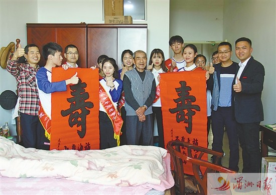 图为志愿者为老人献上书法作品,祝福他们健康长寿。