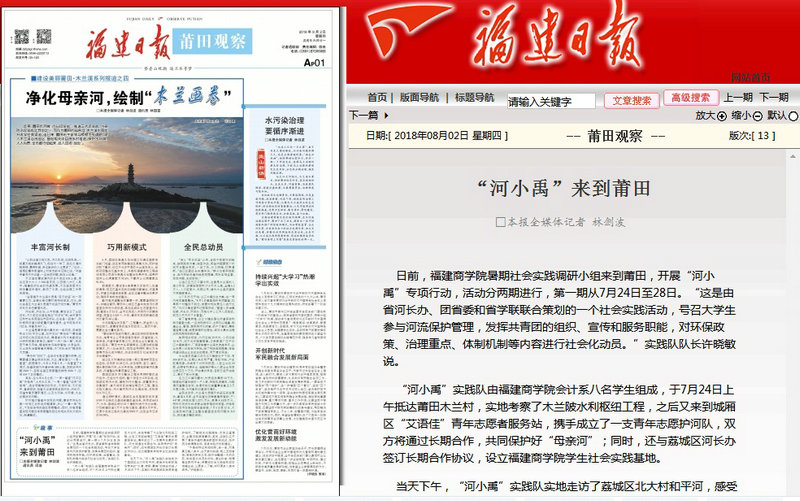 8月2日,福建日报《莆田观察》专版以《‘河小禹’来到莆田》为题,报道了金年会会计系暑期社会实践调研小组在莆田开展“河小禹”专项志愿活动的相关情况。