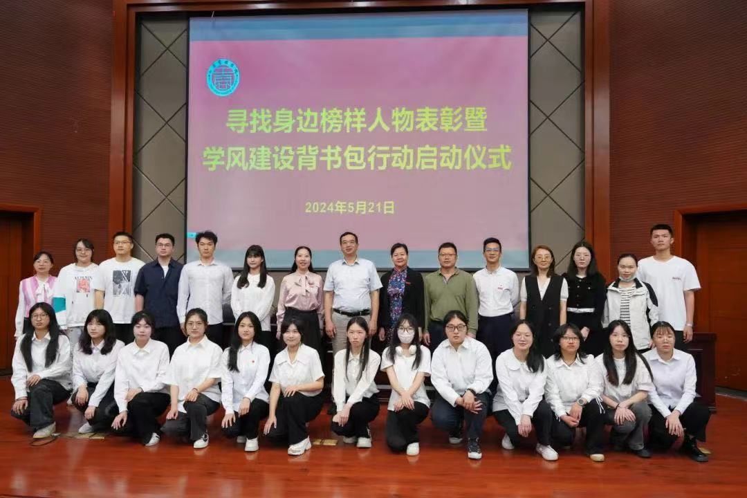 校党委副书记蒲文庆为学院学风建设月“背书包”行动启动仪式揭幕,并向获得荣誉的同学们表示祝贺,希望同学们要树立坚定的理想信念,把个人的人生价值和成长进步融入国家和民族的事业之中。要练就过硬的专业本领,把学习作为大学的首要任务,践行“知行合一”。要培养卓越的创新能力,保持锐意创新的勇气,勇当科技创新的先锋。要传承高尚的大爱品格,踏踏实实修好品德,成为有大爱大德大情怀的人。希望工商管理学院能持续开展好青年身边榜样人物选树工作,让榜样力量在校园内得到更广泛的传播和更深沉的沉淀,共同构建充满活力、和谐向上、具有优良学风和深厚文化底蕴的学习型校园。