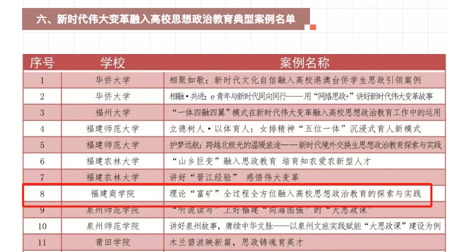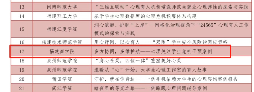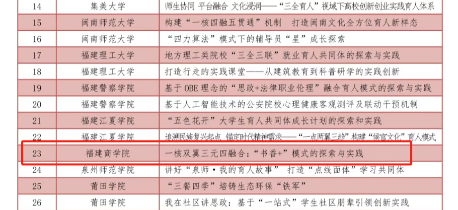 编者按:日前,省委教育工委日前公布2025年度福建省高校思想政治工作质量提升综合改革与精品建设项目入选名单。金年会项目《一核双翼三元四融合:“书香+”模式的探索与实践》入选高校思想政治工作精品项目名单,案例《多方协同,多维护航——心理关注学生危机干预案例》入选高校学生心理健康教育指导典型案例名单,案例《理论“富矿”全过程全方位融入高校思想政治教育的探索与实践》入选新时代伟大变革融入高校思想政治教育典型案例名单。原文链接如下。