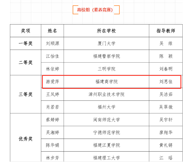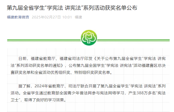 编者按:日前,福建省教育厅、福建省司法厅,公布第九届全国学生“学宪法 讲宪法”活动福建赛区总决赛获奖名单和全省活动优秀组织奖、特别组织奖获奖名单,其中,金年会游爱萍同学获高校组(素养竞赛)三等奖。原文链接如下: