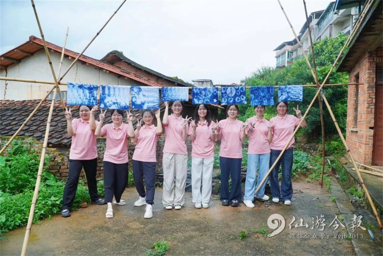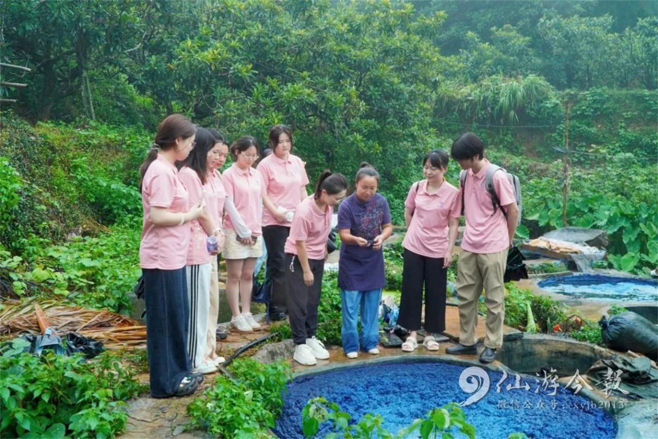 书峰乡被誉为“青黛之乡”,仙游青靛提炼技艺和印染技艺更是分别被列入省级和市级非物质文化遗产名录。实践队成员们在青黛印染非遗传承人黄碧红的带领下走进四黄村,先后探访青黛印染体验馆、参观打蓝工艺、体验青黛扎染技艺。