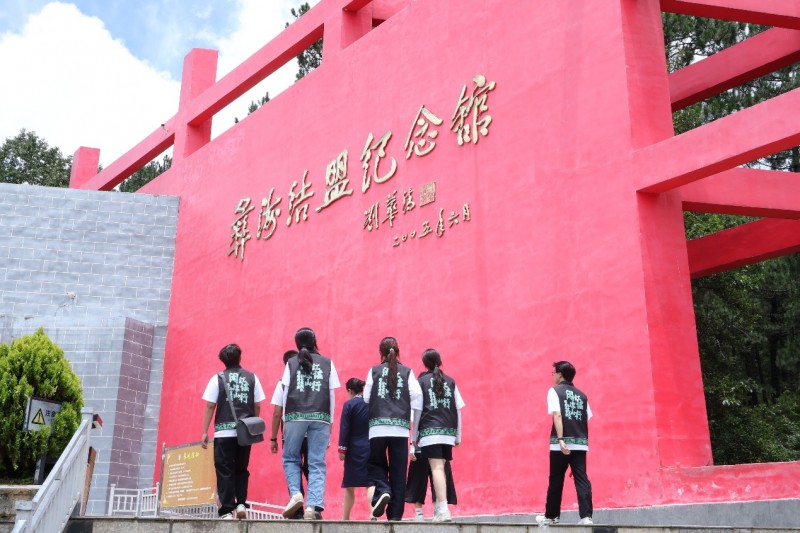 7月8日,冕宁的晨雾尚未散尽,实践队已在县团委副书记李伍沙的寄语中叩响历史之门——“你们的推普行动,正是新时代续写彝海‘同心’精神的火种传递。”当解说员的手指划过彝海结盟纪念馆的浮雕,刘伯承与小叶丹歃血为盟的瞬间在光影中苏醒,18双年轻的眼睛里泛起泪光的涟漪。负责思政微视频的队员迅速架起摄像机,让结盟石上“民族团结”的铭文与队员们庄严的宣誓声,在取景框里完成跨越89年的时空对话。午后,实践队与西昌医专团队以彝族达体舞的节奏破冰,从普通话正音练习到急救技能互教,两个青春方阵在欢声笑语中熔铸成新的“同心圆”。