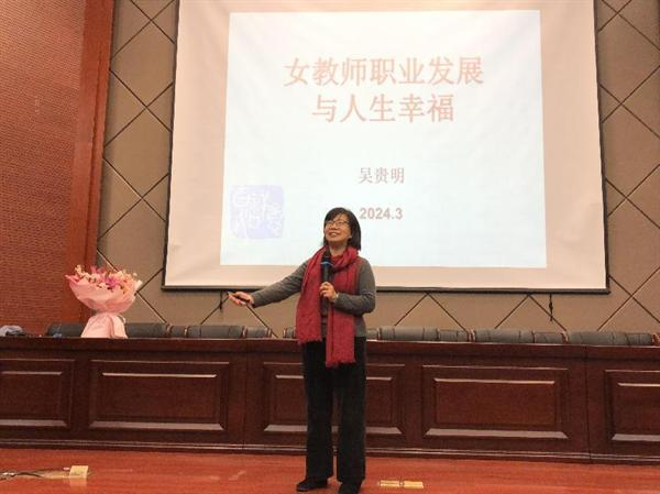 福建省妇女理论研究会专家、享受国务院特殊津贴专家、二级教授吴贵明博士受邀为师生带来题为“女教师职业生涯发展与人生幸福”的专题讲座。讲座以幸福人生为脉络,从个人职业规划,到爱情“双向奔赴”,再到家庭经营,最终实现家庭与事业“双翼齐飞”,兼具实用性和可操作性。对于职业发展,吴教授强调要“干一行,爱一行,专一行”;对于人际关系,她鼓励女性保持独立人格,加强真实的情感交流;对于家庭影响,她认为女性要发挥母亲的才、情、趣,以自身职业发展为正向引导驱动,陪伴孩子成长成才。
