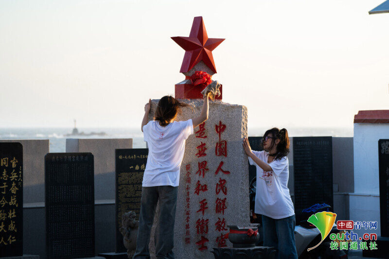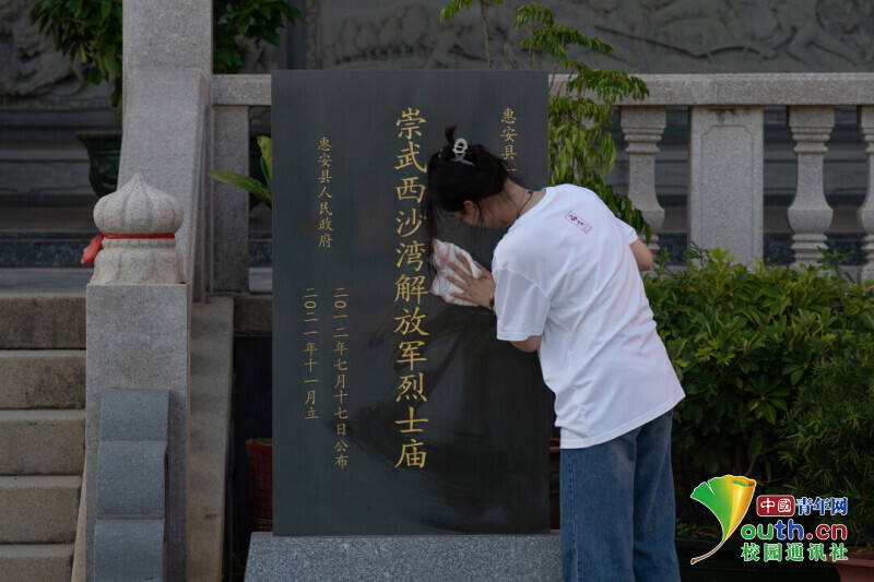 实践队在解放军烈士庙擦洗纪念碑志愿服务活动