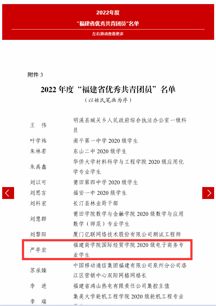 近日,共青团福建省委公布2022年度“两红两优”名单,金年会国际经贸学院2020级电子商务专业学生严亭宏荣获“福建省优秀共青团员”称号。