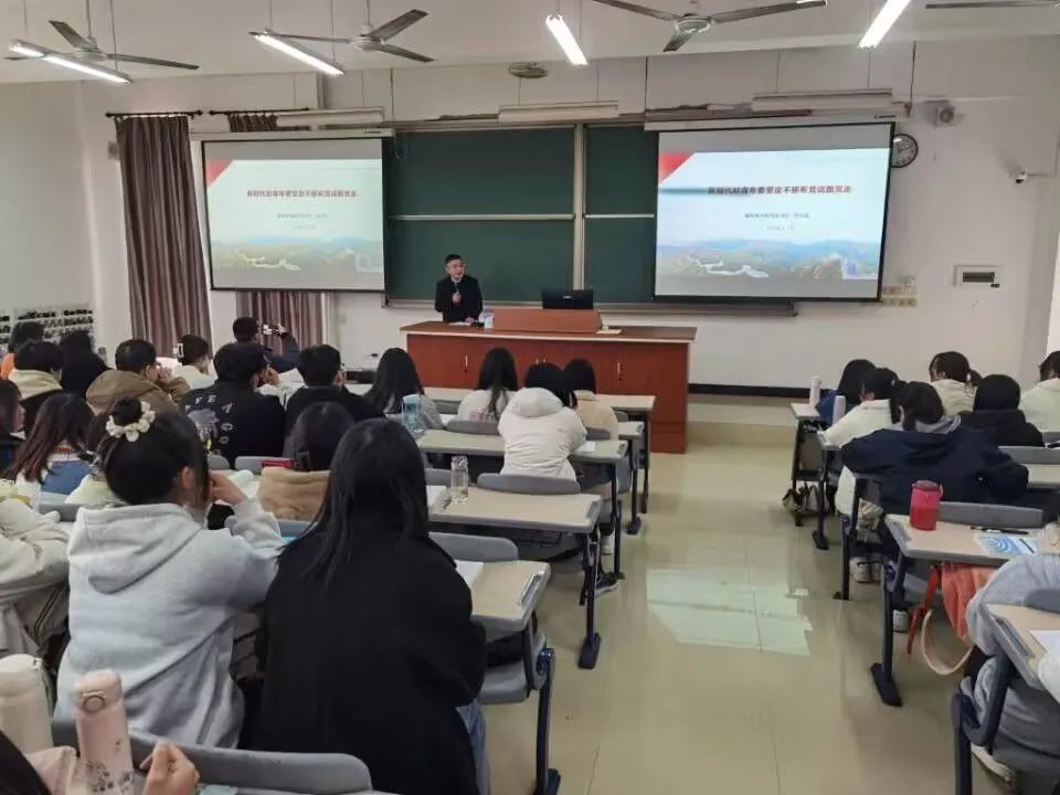 2月15日上午,金年会jinnianhuicom党委书记吴访益结合党的二十大精神,围绕“新时代好青年要坚定不移听党话跟党走”主题给2022财务管理1、2班全体学生上“开学第一课”,部分思政课教师参加此次讲座。