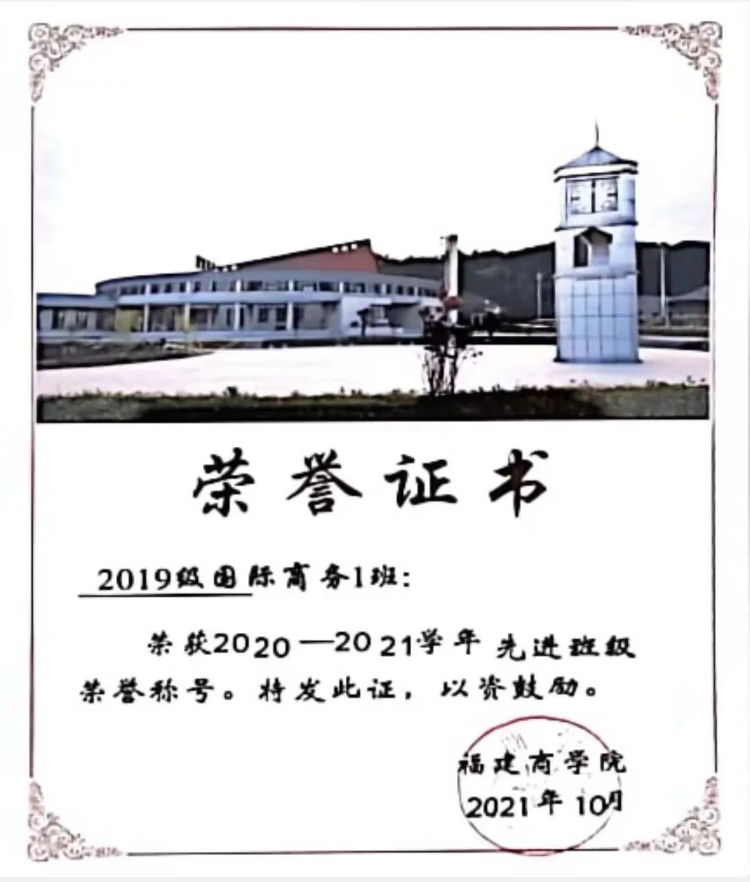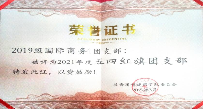 2019级国际商务1团支部于2019-2020学年第一学期在福建共青团智慧团建被评为“五星团支部”;2019-2020学年四度荣获院级“学习先进团支部”称号;2020年5月被评为院级“五四红旗团支部”;2020年6月被评为校级“五四红旗团支部”;2020年5月赢得院级“绽放战疫青春,坚定制度自信”主题团日活动二等奖;2020-2021学年被评为“先进班级”;2021年度被评为校级“五四红旗团支部”。