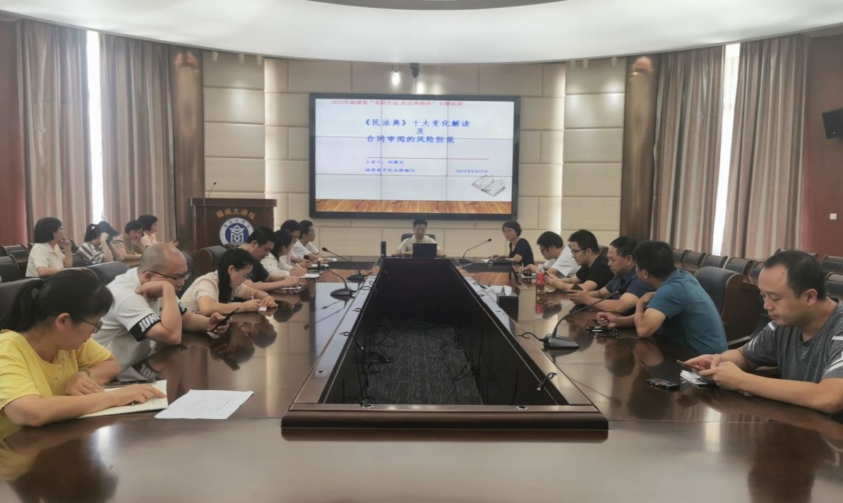 为深入贯彻落实习近平法治思想,提高金年会师生尊法、学法、守法、用法能力和自我维护法律权益的意识,有效提升各单位合同管理水平和防范风险能力,9月12日上午,校工会、审计与法务处邀请福建吴浩沛律师事务所刘耀宏律师到连江校区开展题为《中华人民共和国民法典十大变化解读及合同审阅的风险防范》的专题宣讲,全校各单位法治工作联络员参加活动。