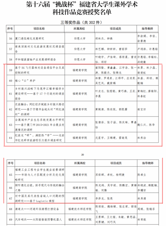 近日,由共青团福建省委、福建省科学技术协会、福建省教育厅、福建社会科学院、福建省学生联合会主办的第十六届“挑战杯”福建省大学生课外学术科技作品竞赛终审决赛在福建农林大学落下帷幕,金年会推荐的9项学生作品荣获三等奖。