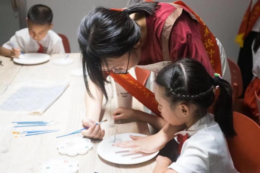 釉下彩绘小组细心地为小学生们讲解作画工具的使用,与他们沟通交流设计图案的思路。小学生们充分发挥他们的想象力,在素烧的盘子、杯子上绘出一个个精彩的图案,体验釉下彩绘的乐趣与魅力。