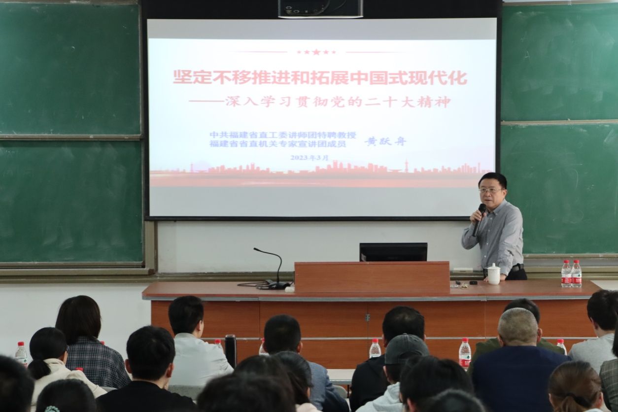 3月21日下午,中共福建省直工委讲师团特聘教授、省直机关专家宣讲团成员黄跃舟应邀到金年会开展“坚定不移推进和拓展中国式现代化——深入学习贯彻党的二十大精神”专题讲座。马克思主义学院部分教师、连江校区“青马”班部分学员、校习近平新时代中国特色社会主义思想读书社部分社员参加学习。