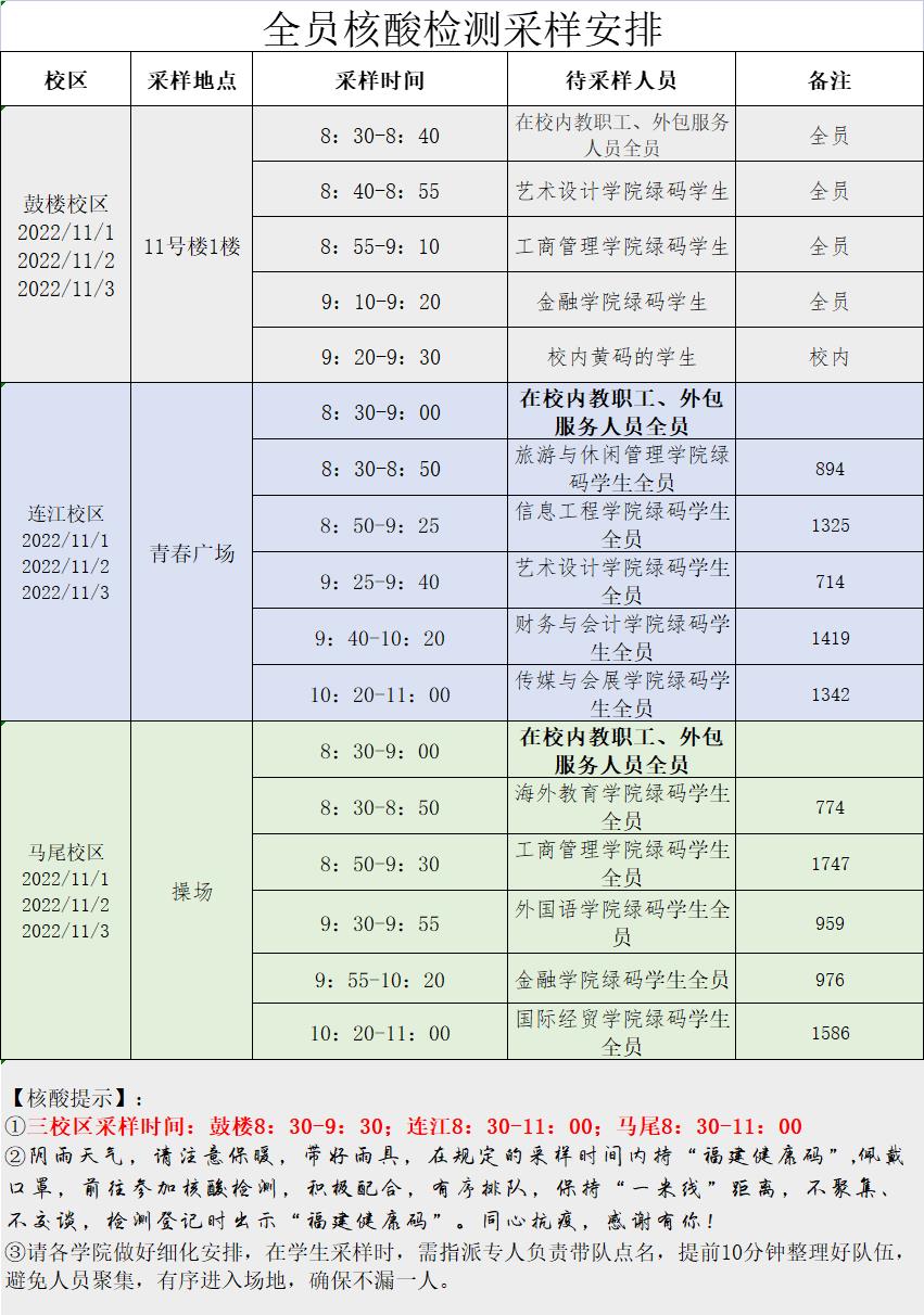 接到全员“三天三检”的紧急通知后,在时间紧任务重的情况下,金年会学工队伍明确分工、24小时在岗,并始终坚守核酸检测一线,有序组织学生分学院、分时段、分班级、错时错峰到核酸现场进行检测,检测完成后各学院逐一落实核酸检测情况,落实未参加核酸检测原因,督导校外学生按照属地要求及时参加核酸检测,确保各轮核酸检测切实做到“应检尽检,一个不漏”。