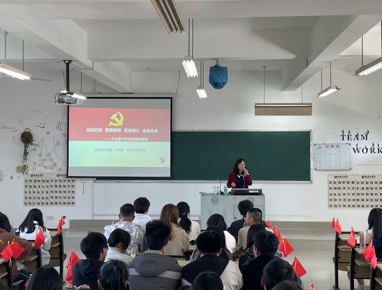 伊文婷教授从“为什么学”“学什么”“怎样学”等三个方面作为切入点,深入讲解习近平新时代中国特色社会主义思想的核心内容和中国共产党百年奋斗的十大历史经验,系统阐述全会的主要精神、重大意义,以及如何学习落实全会精神。宣讲过程中,伊文婷教授还就“什么是中国式的现代化道路”等问题,与现场师生进行深度交流。