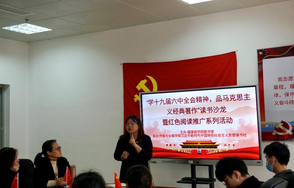 近日,传媒与会展学院习近平新时代中国特色社会主义思想读书社携手校图书馆读者服务部,在连江校区图书馆三楼视听会议室共建举办“学十九届六中全会精神,品马克思主义经典著作”读书沙龙暨红色阅读推广系列活动,图书馆有关人员与读书社师生近30人参与本次活动。