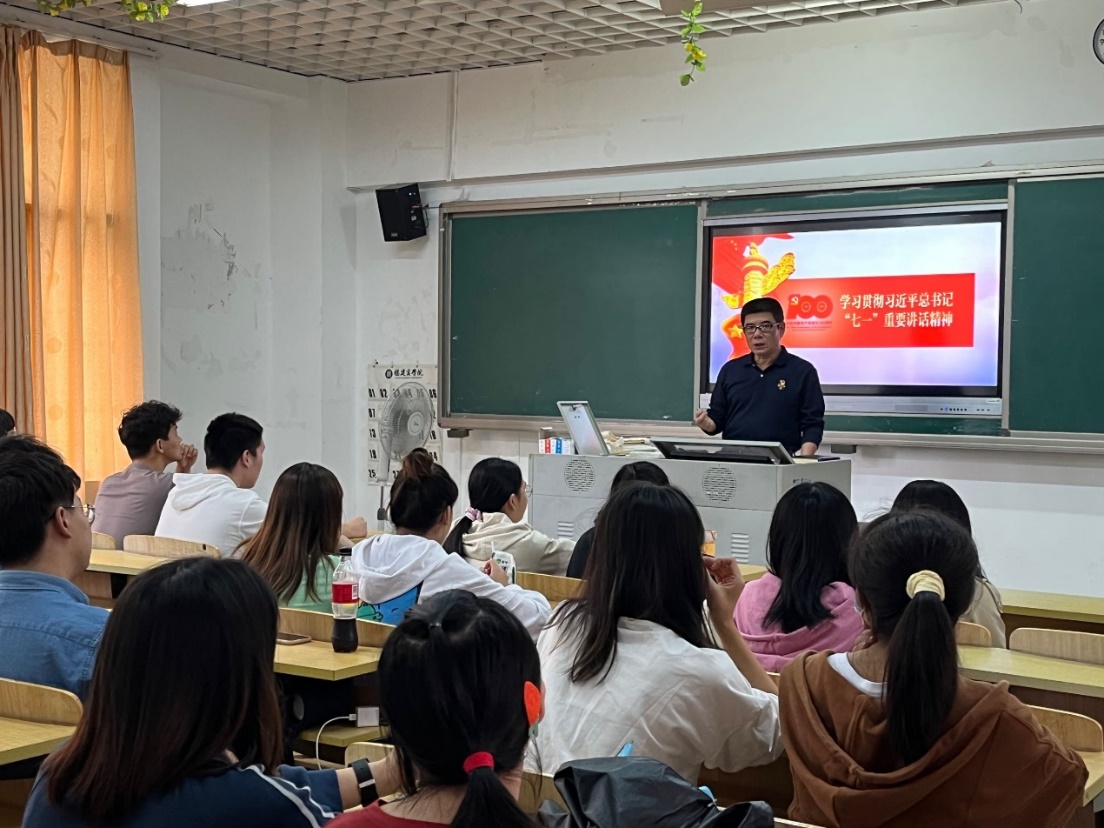 黄旭东老师从“两个一百年”奋斗目标“实现中华民族伟大复兴的主题”“四个伟大成就”“伟大建党精神”以及“以史为鉴开创未来的‘九个必须’”等方面阐述了习近平总书记“七一”重要讲话内容,阐释了中国共产党为人民谋幸福、为民族谋复兴的初心使命,回顾了新中国的发展历程。他以学生喜闻乐见的形式,激励青年一代应坚持真理,坚守理想,努力学习,勇于创新。