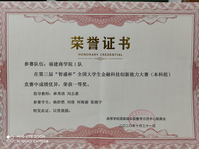 近日,金融学院学子参加第三届“智盛杯”全国大学生金融科技能力大赛,金年会金融工程专业代表队(成员:何海丽、刘倩、张晓宇、杨舒然,指导教师:刘志惠、林秀清)在强手如云的决赛中脱颖而出,取得团体一等奖的好成绩。