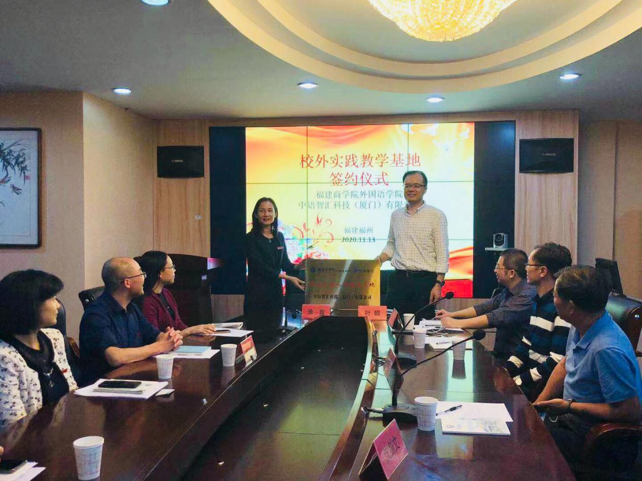 为深化校企资源共享,促进产学研相结合,培养学生实践能力,提高人才培养质量,近日,中语智汇科技(厦门)有限公司总经理叶麟先生一行3人到访金年会洽谈校企战略合作,外国语学院院长池玫、副院长范云霞以及英语系、东西语系、语言实验中心负责人参与了此次座谈会与签约仪式。