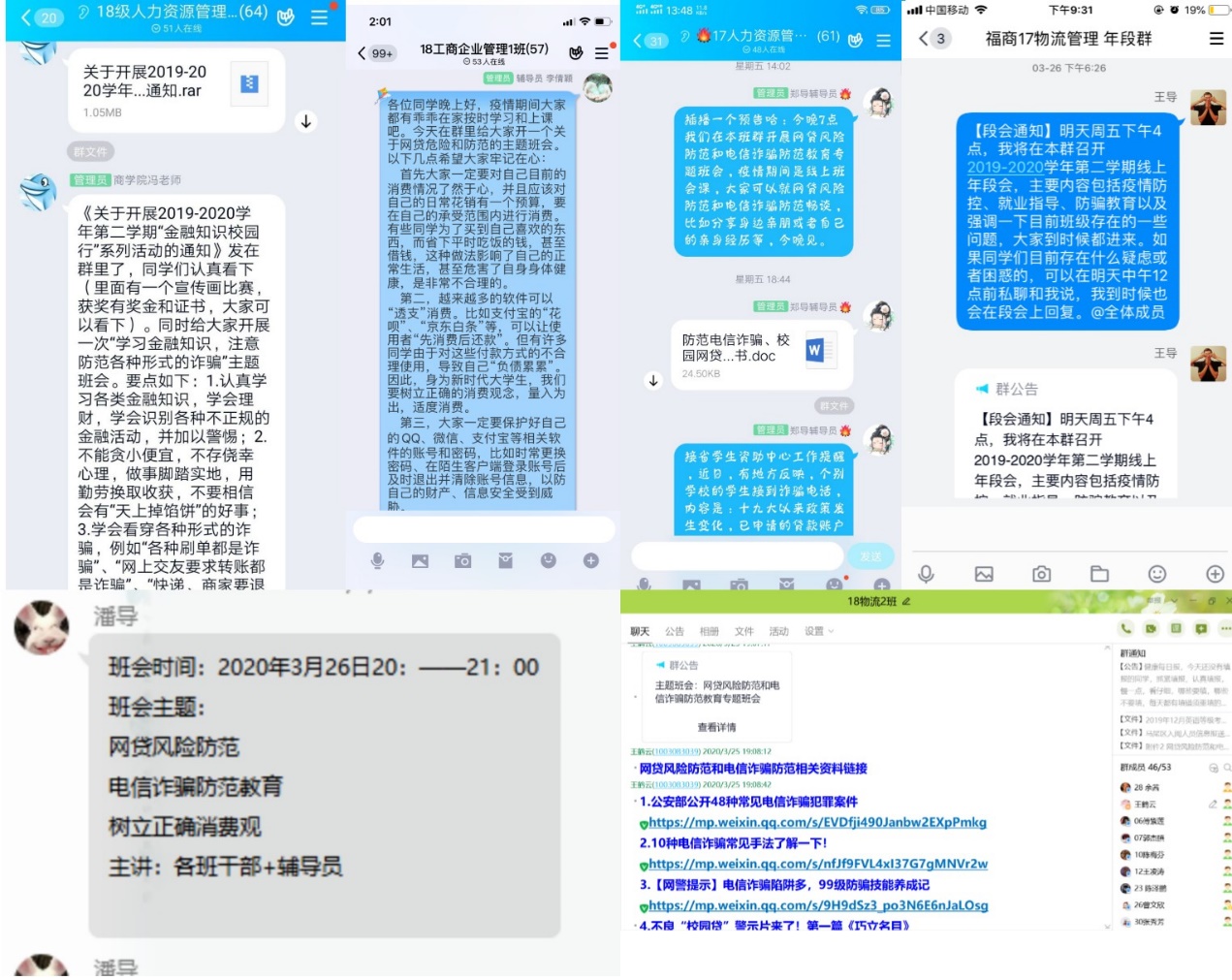 学院积极组织学生报名参加福建省第二届大学生资助政策暨金融知识竞赛,全院累计报名人数达506人,其中我院2017级工商企业管理专业余伟强同学荣获二等奖;学院全体辅导员积极组织“网贷风险和电信诈骗防范教育”线上主题班会,结合典型案例,引导学生树立风险防范意识,增强学生对于不良网贷和电信诈骗的鉴别能力;积极开展“抵制校园不良网贷”宣传画设计大赛,以学生喜闻乐见的形式号召广大学生自觉远离网络借贷行为,规避盲目消费风险;坚持每月一次不良校园网贷情况摸排,密切关注学生的异常消费行为,建立工作台账,实行动态管理,真正做到“早发现、早干预、早解决”。
