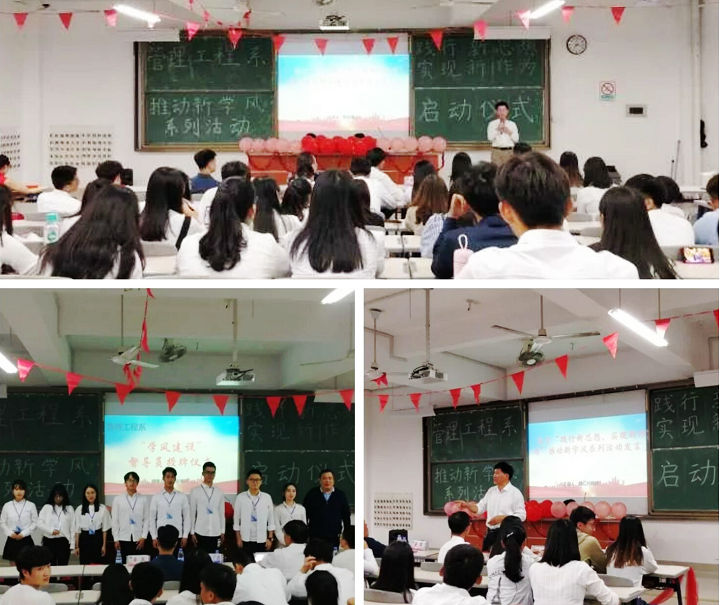 本学期初,管理工程系成立了由系党总支副书记郭海云、系主任魏仁兴担任组长的“新学风”工作小组,制订了《管理工程系学风建设考勤实施办法》,认真组织开展“新学风”建设活动。活动由团总支牵头组织,各教研室配合参与,主要通过主题教育、专业实践、学风督导、奖惩激励等举措,积极将全系学风建设引向深入。
