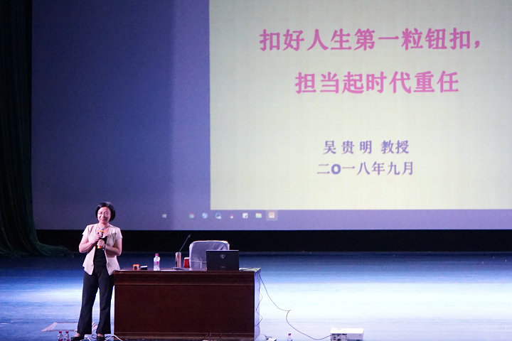 吴贵明教授在报告会上与师生们一起重温“两个一百年”奋斗目标。她说,当前我国正处于实现“两个一百年”奋斗目标的关键时期,正是广大青年奋发有为,实现人生理想和自我价值的美好新时代。希望每个人都要主动担负起新时代赋予当代青年的重任,珍惜大学时光,扣好人生第一粒纽扣,认真学习,努力实践,不断提高思想水平,优化知识结构,树立正确的人生观、价值观和世界观,用奋斗开启美好人生路。她还说,人生道路是条单行道,三到四年的大学时光看似很长,但真正用于学习的时间并不多,每个人都必须珍惜时光,做到知行合一,有目标、有思考、有坚持地完成学习任务,通过勤奋学习,求得真学问,练就真本领,做一名实干家,不给美好的大学时光留下遗憾。