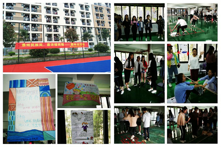 本次实践教学活动由专业教师带领16级旅游管理、休闲服务与管理、旅行社经营管理三个专业班级的同学,结合《休闲旅游策划与管理》《休闲活动策划与管理》课程内容,理论联系实际,发挥创新、创意,共同参与策划、组织、实施等教学活动。师生围绕“最炫民族风,最浓福商情”这一主题,共同设计了“民族趣味运动会”活动各环节。活动中,同学们根据任务要求,设计了许多特色的手绘海报、签到牌、号码牌告等活动材料,设置了“竹竿舞”“撞拐子”“投壶”“赛跳跑”“抢花炮”“跳房子”等一系列贴合主题、趣味性十足、有一定的竞技性的游戏,并尽情参与其中。