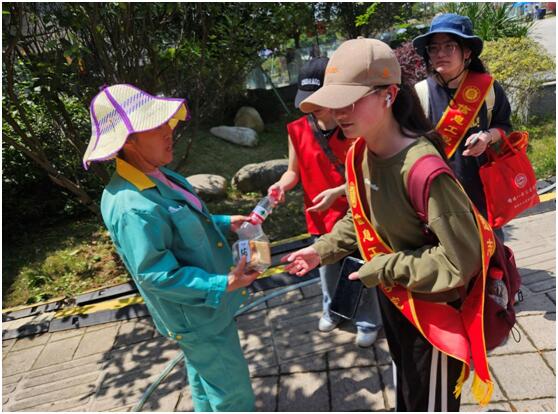 活动当天,阳光明媚,志愿者们一边沿着预定路线徒步前行,一边开展志愿服务,大家互相鼓励、互相扶持,看见景区垃圾随手拾起。志愿者们通过支付宝“行走捐”将步数捐赠兑为公益金,为扶贫、教育、环保贡献自己的一份微薄之力。徒步结束之后,志愿者们还为景区的环卫工人送上矿泉水和面包。