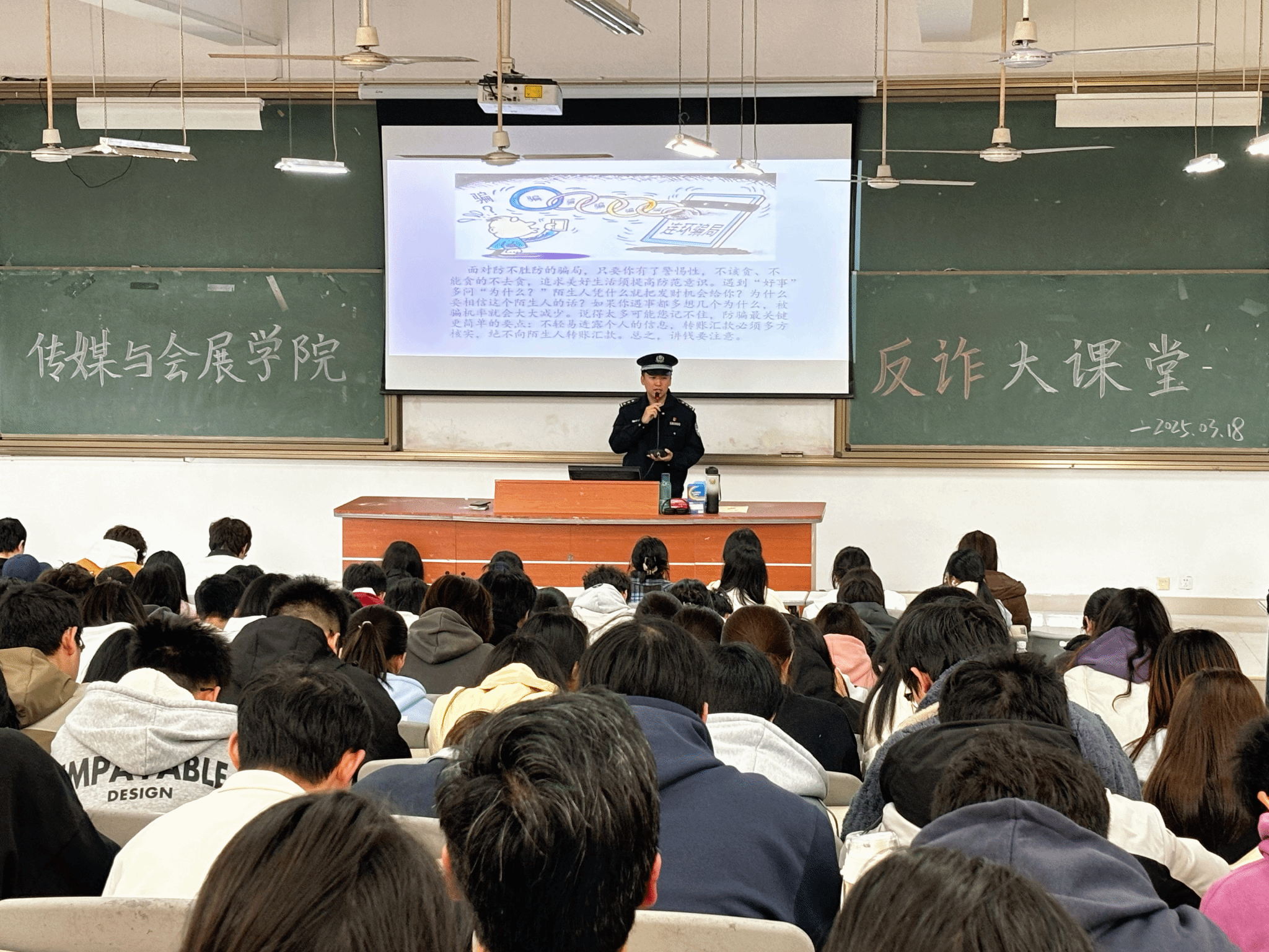 3月18日,传媒与会展学院联合潘渡派出所开展“反诈大课堂”活动,邀请潘渡派出所林俊警官担任主讲。