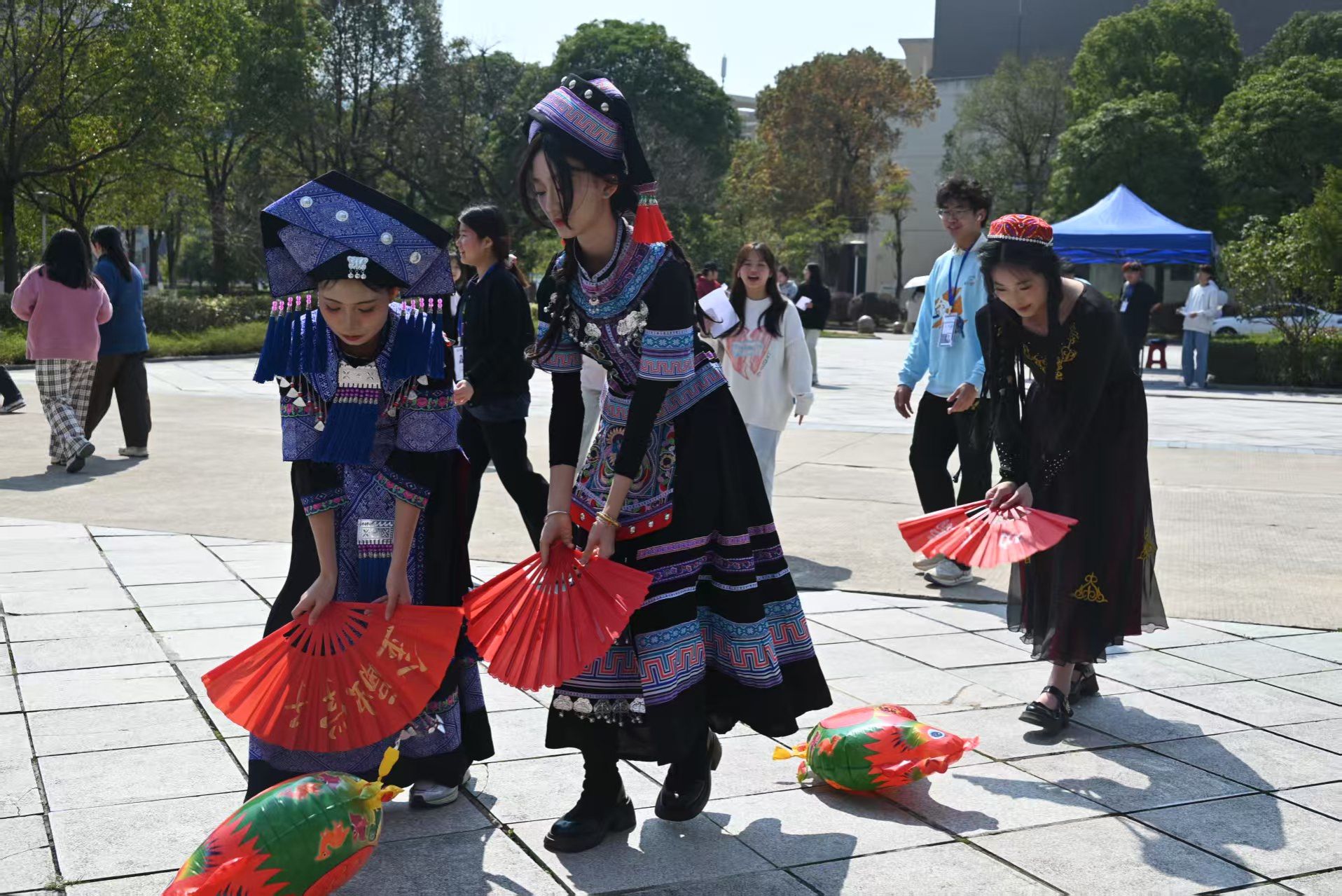 校内活动现场,同学们身着绚丽多彩的民族服饰,或端庄典雅,或活泼灵动,尽情展示着中华民族服饰文化的独特韵味。同学们开展少数民族特色体验活动,在比技巧、赛默契的趣味互动中,深切感受着民族传统游戏所蕴含的智慧与文化底蕴。在随后的拔河比赛中,同学们用团结协作的生动实践诠释了“中华民族一家亲”的深刻内涵,展现了新时代福商青年昂扬向上的精神风貌。