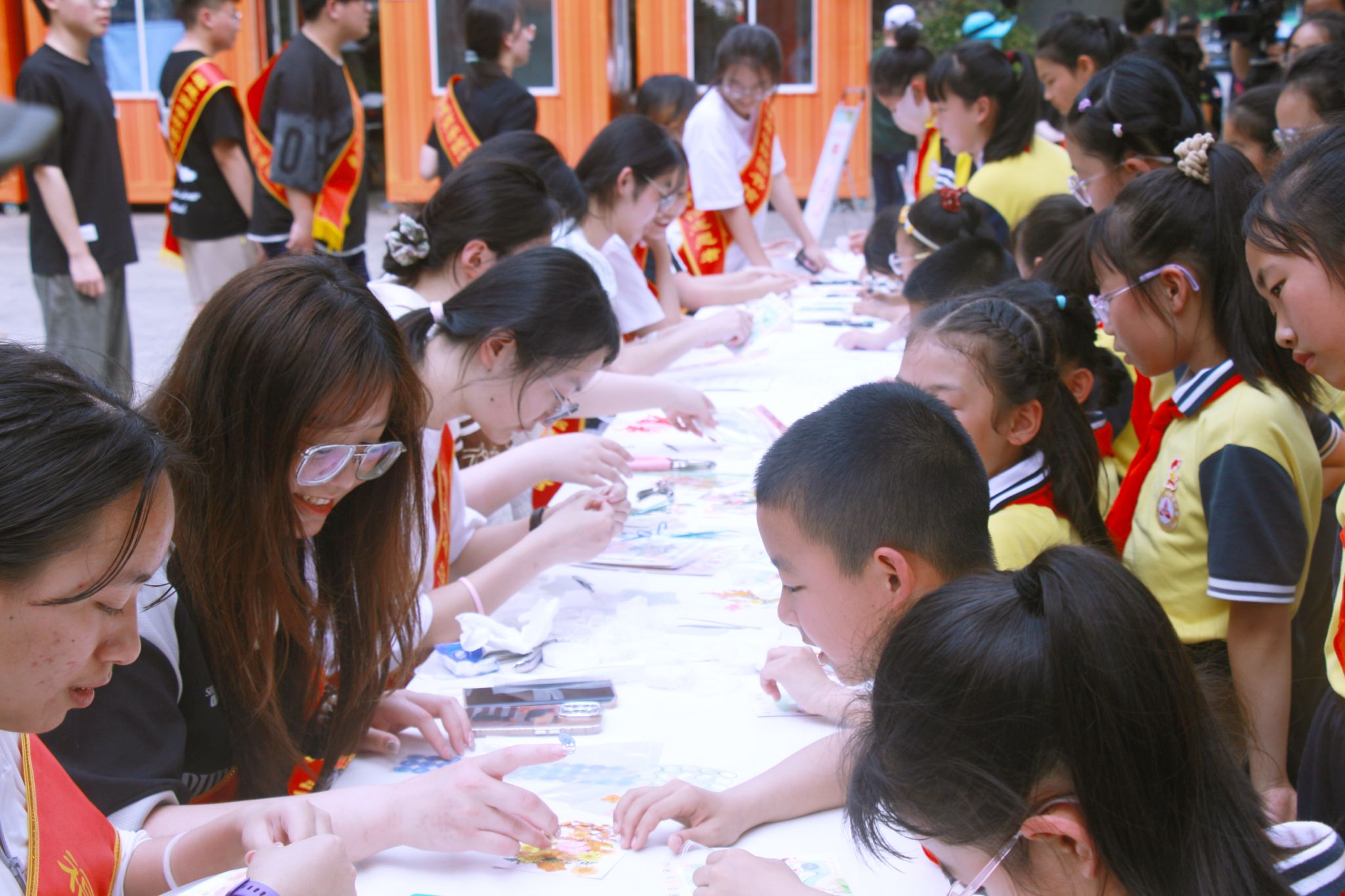 活动现场,大学生志愿者向社区小学生们讲解书封设计背后蕴含的文化内涵,共同制作精美的干花书签、默写诗词名句、竞猜书名,志愿者们与小学生朋友们热情互动,既感受到知识的魅力,也体验到阅读的乐趣。