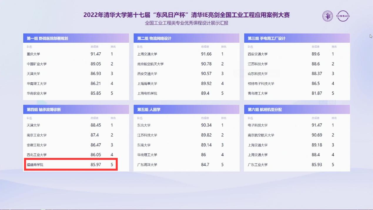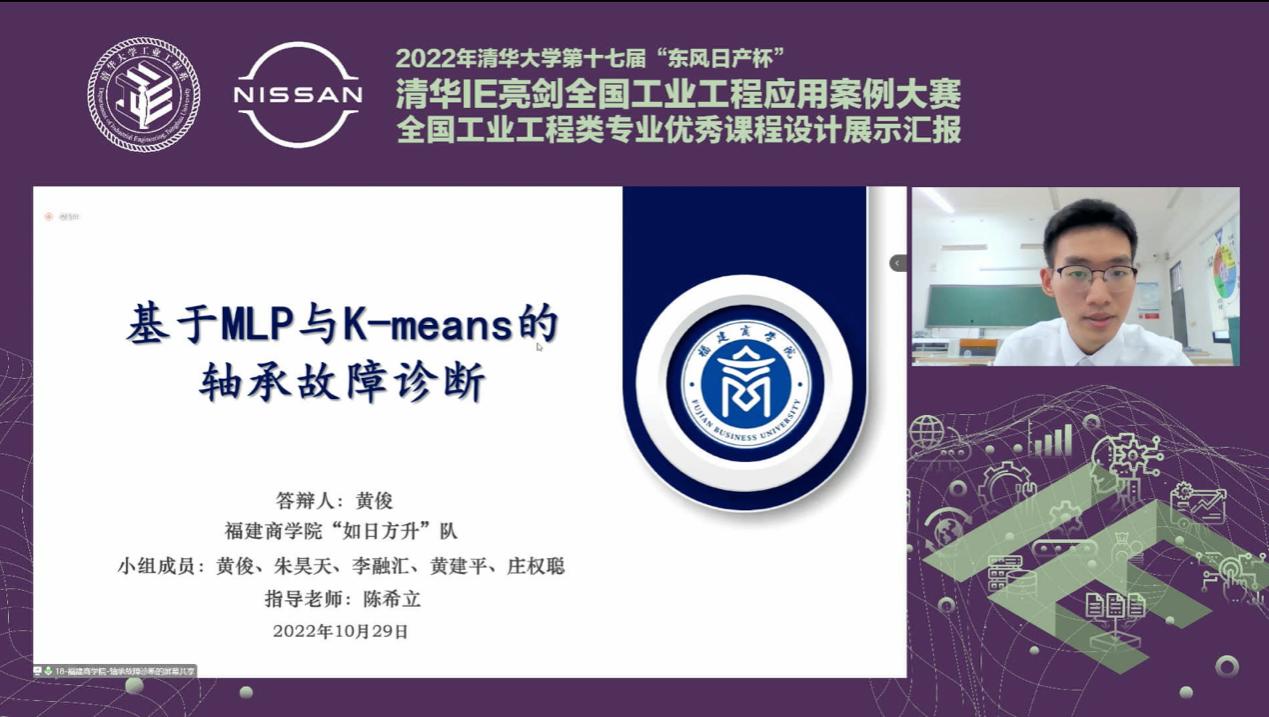 10月29日,在“第十七届‘东风日产杯’清华IE亮剑全国工业工程应用案例大赛”中,金年会传媒与会展学院管理工程系工业工程专业参赛代表队(黄俊、朱昊天、李融汇、黄建平、庄权聪,指导老师陈希立)凭借参赛项目——“基于MLP与K-means的轴承故障诊断”,以决赛第五成绩荣获二等奖,实现了金年会在该项赛事上的重大突破。