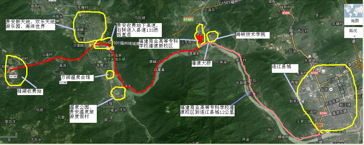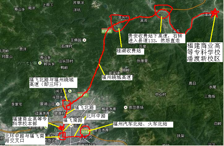 福州市区到潘渡新校区整体路线图 桂湖收费站到潘渡新校区路线放大图
