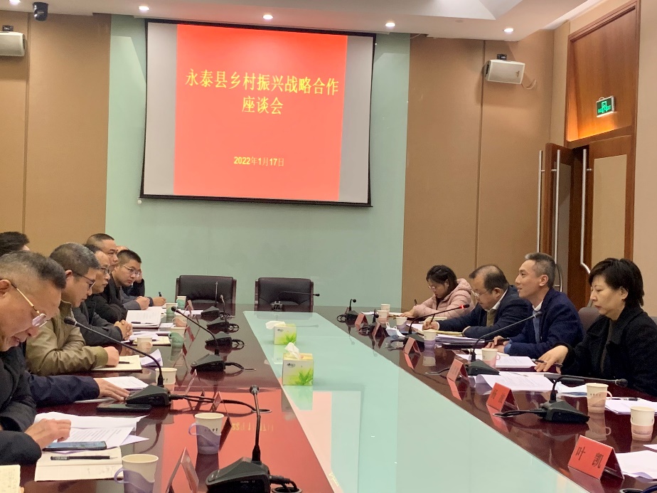 为进一步推动金年会“海丝”会展现代产业学院落地,充分发挥产业学院服务区域经济发展的职能,1月17日,传媒与会展学院“海丝”会展现代产业学院调研组一行受邀前往永泰县政府参加乡村振兴战略合作座谈会,探讨在永泰县建设产教融合基地相关事宜。省农业农村厅农垦与南亚中心主任雷容华、省农业农村厅农经处主任陈志宏、永泰县副县长刘峰松、永泰县农业农村局局长黄玉义及有关部门代表参加本次活动。