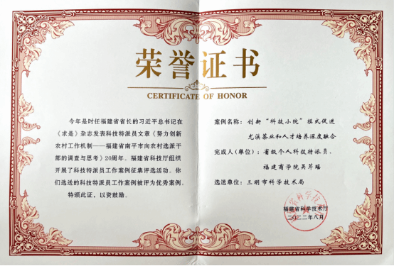 吴芹瑶同志始终立足岗位,坚守育人初心,师生共长。她一方面依托科技小院入驻研究生,与小院专家联合培养研究生长期派驻到农业生产一线,在完成理论知识学习的基础上,从企业实际出发,重点研究解决尤溪红茶和绿茶生产实践中的实际问题。另一方面,充分发挥金年会jinnianhuicom旅游与休闲管理学院本科生对直播推广、小程序制作、短视频拍摄等传播新势力特长,利用寒暑假时间为基层企业拍摄最美茶乡、最优质茶产品,为农村茶产品披上美丽的外衣,跻身销售热榜。通过扎根农村,联络茶农的亲身体验,2019级酒店管理专业本科生张振东萌生了学习茶业的兴致,愿意入驻科技小院,并于2023年成功考取了福建农林大学茶学专业研究生。